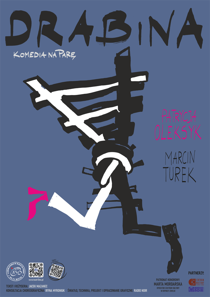 Krynica Zdrój ma wiele perełek. Jedna z nich przytrafiła się zupełnie nieoczekiwanie. Do miasta zajechała grupa teatralna Teatr 13 ns - Laboratorium Małych Form. W Centrum Kultury w Krynicy Zdroju wystawiła sztukę "Drabina, Komedia na Parę". W zapowiedzi jest to komedia. Wydawało mi się, że spotkam się z lekką, wakacyjną realizacją. Nic z tych rzeczy. Owszem są elementy śmieszne. Jest to jednak dowcip sytuacyjny. Forma wydaje się niekiedy infantylna, jednak treści nie są podane bezpośrednio. Nie ma elementów przaśnych, ludowych. Nie ma też zadęcia. Silenia się na moralizowanie o uniwersalnych i znanych prawdach czasu - wprost. Teatr 13 realizuje zamysł Teatru Otwartego. Funkcjonuje w obiegu pozainstytucjonalnym. Łamie schematy. Znosi barierę między widzem i aktorem. Otwierając się na kontakt, nawet bezpośredni dialog z widzem. W Krynicy odbył się pierwszy z całej serii wakacyjnych prezentacji tej sztuki. I chociaż ma już ona swoją historię, to po słowie reżysera, Jacka Mazaneca, był to jeden z pierwszych wspólnych przedstawień aktorskiej pary: Patrycji Oleksyk i Marcina Turka. Duet pokazał bardzo dojrzały warsztat. Występująca para zgrała się ze sobą idealnie. Bez zgrzytów, z polotem i talentem. Pierwszy pokaz można nazwać premierą na krynickiej scenie. W naszym niewielkim gronie widzów wypadło to znakomicie. Chylę nisko głowę przed kunsztem dwójki aktorskiej. Włożyli zapewne sporo pracy, aby wypadło to jak najlepiej. Sztuka nie jest trywialna. Trzeba skupić się nad pełną ironii treścią. Nie jest to proste. Historia na początku wydawać może się błaha. Spotkanie wzajemnie skonfliktowanych: reżysera i aktorki. Każdy ma swoją wizję teatru i gry w nim. Wzajemne utarczki bohaterów osiągają poziom absurdu. Tematy oscylują wokół poważnych zagadnień. Jednym z nich będzie rola i miejsce Teatru. O sile przekazu i jego autentyczności w wielu dostępnych formach.